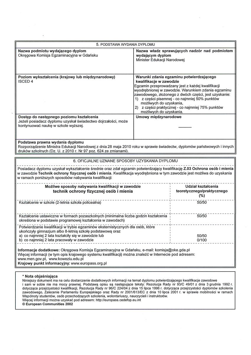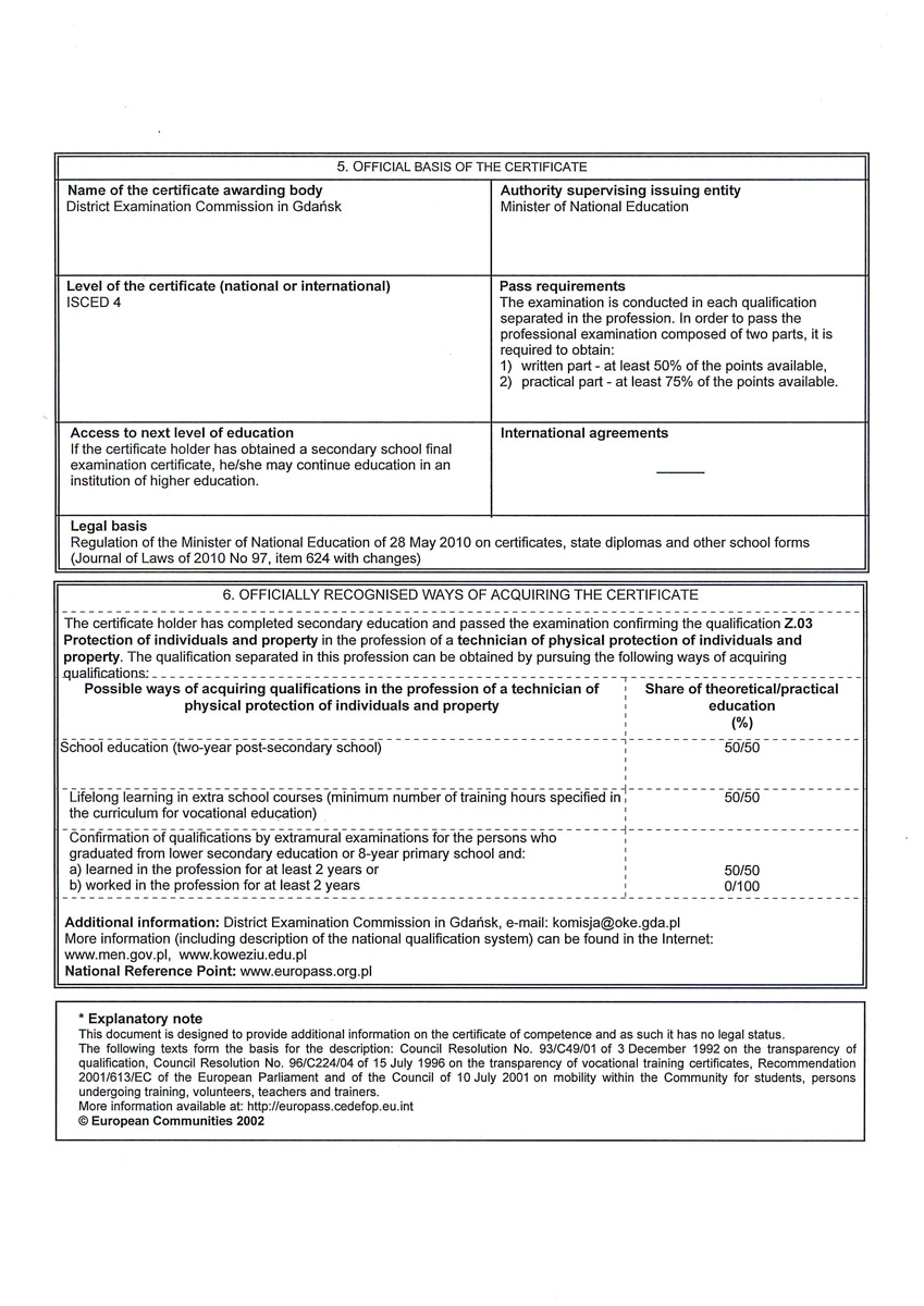 Absolwent, który ukończył szkołę i zdał egzamin zawodowy otrzymuje świadectwo ukończenia szkoły i dyplom w zawodzie technik ochrony fizycznej osób i mienia. Na tej podstawie absolwentowi przysługuje prawo do wpisu na listę kwalifikowanych pracowników ochrony fizycznej osób i mienia, a po zdaniu egzaminu państwowego (w zakresie strzelania) legitymacja osoby dopuszczonej do posiadania broni. Zdobycie zawodu oraz pełnych kwalifikacji uprawnia absolwenta do pracy na wszelkich stanowiskach związanych z ochroną fizyczną osób i mienia w strukturach Specjalistycznych Umundurowanych Formacji Ochronnych (SUFO) – oraz daje możliwość otwarcia własnego, koncesjonowanego biura ochrony osób i mienia.