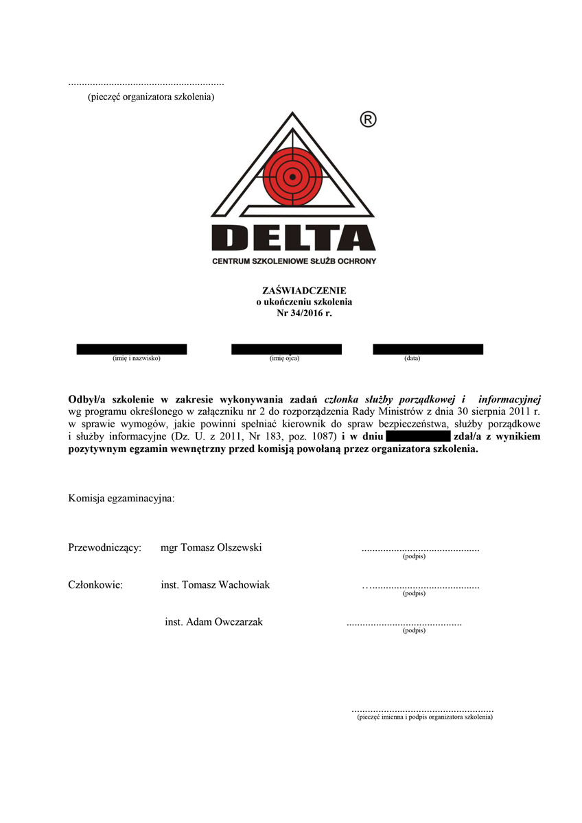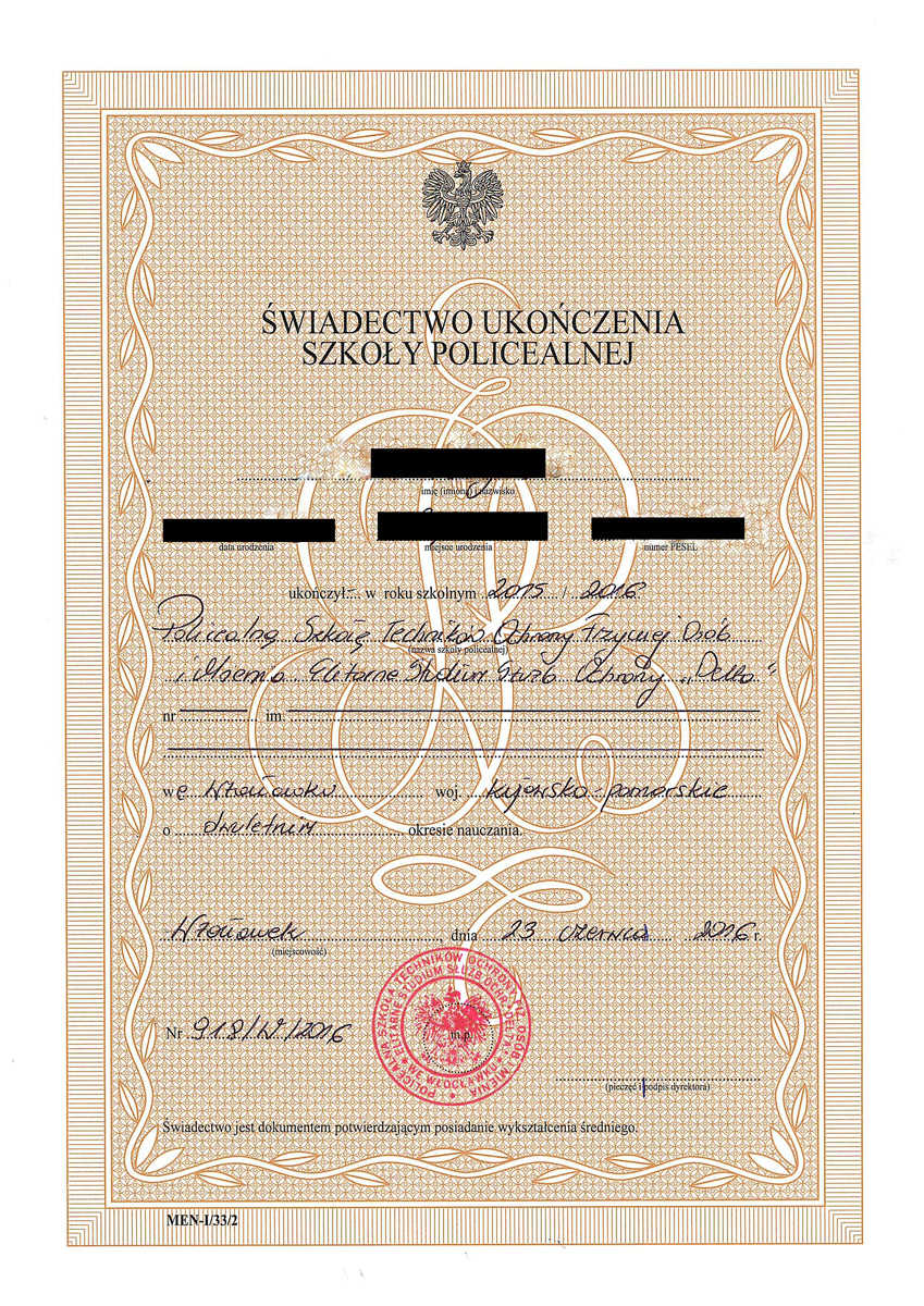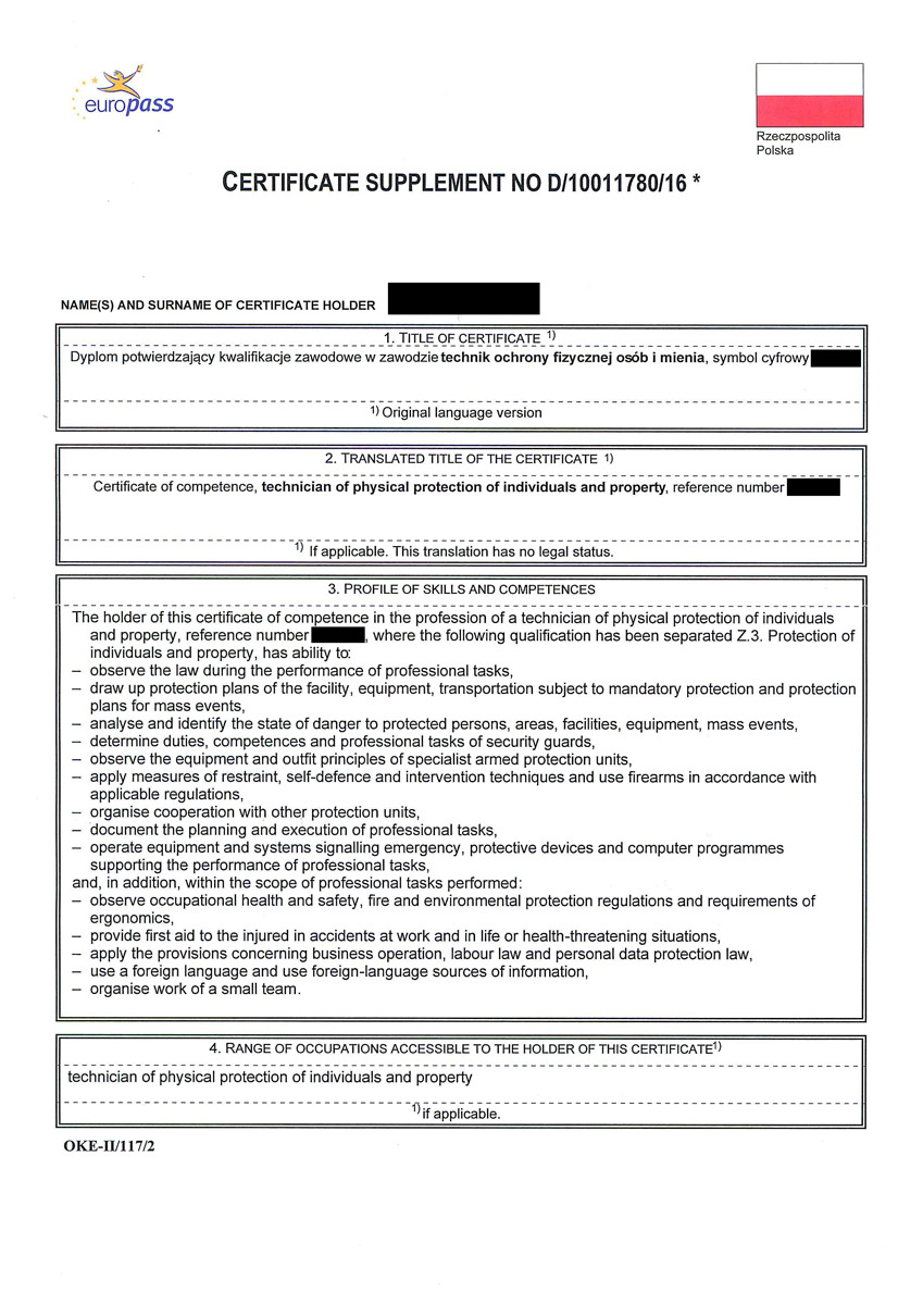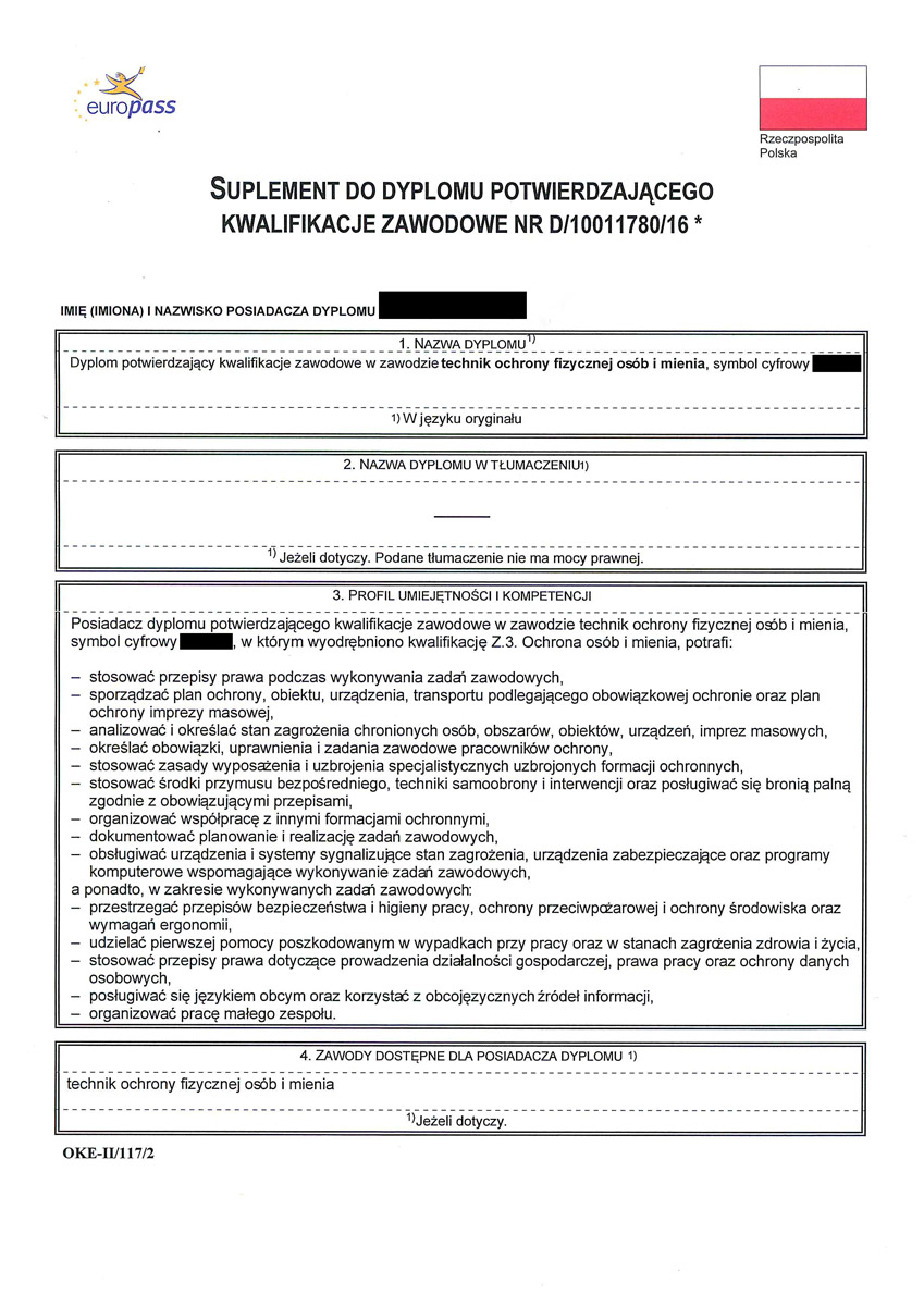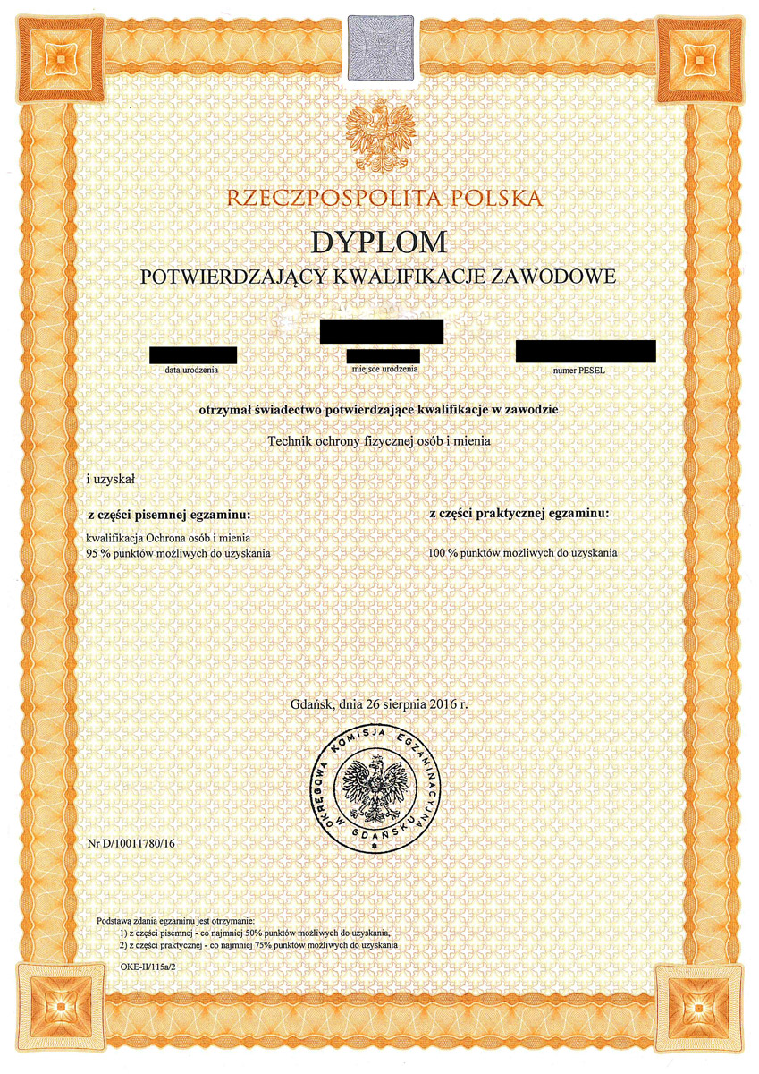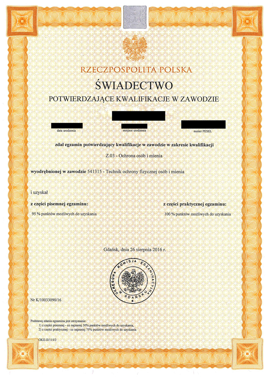 Każdy absolwent naszej szkoły dodatkowo otrzymuje uprawnienia do pracy w charakterze członka służby porządkowej i informacyjnej oraz kierownika ds. bezpieczeństwa przy zabezpieczeniu imprez masowych. Absolwenci posiadają także dodatkowe przeszkolenie w zakresie udzielania pomocy przedlekarskiej, ochrony osób oraz posługiwania się bronią palną krótką i długą potwierdzone certyfikatami.